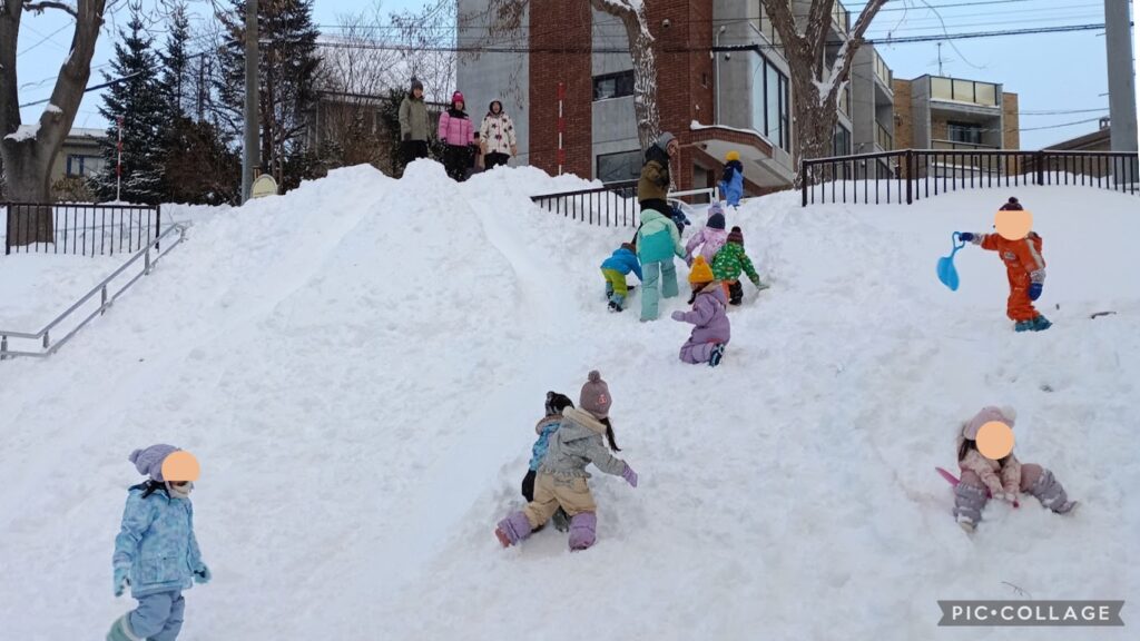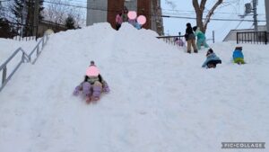 高台公園に着くと、近所の小学生のお友達が作ってくれた、長い長~い雪の滑り台を発見‼️