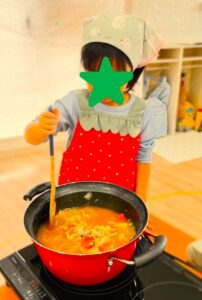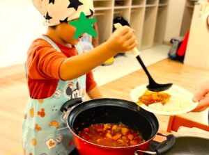 みんなで交互に炒めて混ぜて…..最後は指導員が「おいしいくなぁ~れ♡」でルーを入れて仕上げです☆★