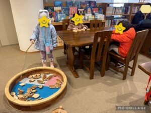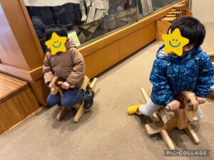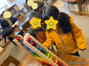絵本や木の玩具があり、早速楽しんでいた子どもたちです🎵