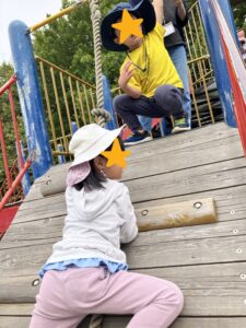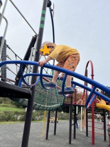 アスレチックにたくましく登ったり…..