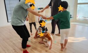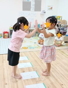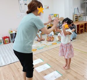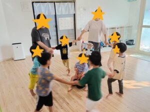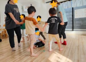 リズムに合わせることで運動感覚や、お友達と触れ合うことで一体感や仲間意識を深めるコミュニケーション能力を促せる遊びです。