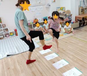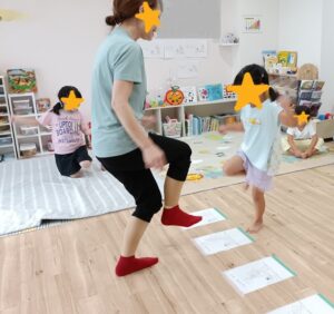 「うふふふ…(*´艸`*)」と笑いながら、わらべ歌や絵や文字による指示に沿った動きを楽しんでいました☆
