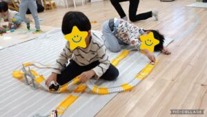 車の道路をつなげる時には、どんな道路にするか、お友達と相談しながら決めて作っています🚗